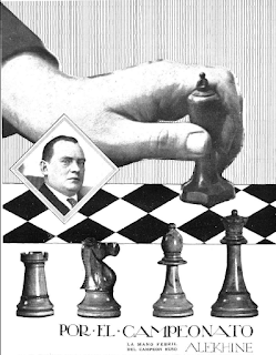 Hoy, en la otra esquina del tablero, una mano aparece, decidida y nerviosa. Trae entre sus dedos a la peligrosa dama. Es la mano de Alekhine, fantástico jugador ruso. Y se oyen las palabras definitivas: "Jaque al rey". Alekhine trae al tablero, frente al genio de Capablanca, una aliada, la imaginación. Sus célebres partidas llevan el moño de la fantasía encima, y su juego es caprichoso como parecen serlo los estilos modernos ante la línea clásica. La sorpresa y el imprevisto son sus heraldos, que al fin hoy son rusos, ya que ellos nos llegan cotidianamente de la Rusia tironeada étnicamente entre su incorporación a Europa o su retorno nacional a Oriente.